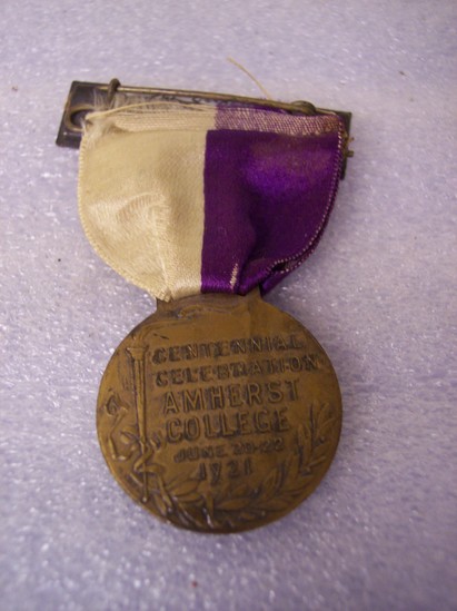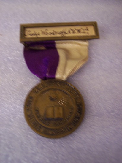 Rectangular bar pin, brass frame around piece of paper. Written in ink on panel "Judge Woodruff A.B.H.L." Purple and white silk ribbon attached to bar pin. Round bronze medal attached to bottom of ribbon. On front in center is an image of the sun shining over an open book. Underneath book "TERRAS IRRADIENT" Around center image "COLL. AMHERST MASS. NOV. ANG MDCCCXXV SIGILL" On the back is an image of a torch and laurel branch with words "CENTENNIAL/CELEBRATION/AMHERST/COLLEGE/JUNE 20-22/1921"