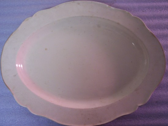 Oval platter. Thin ware, cream colored. With shaped rim and slightly raised edge. Royal pattern.