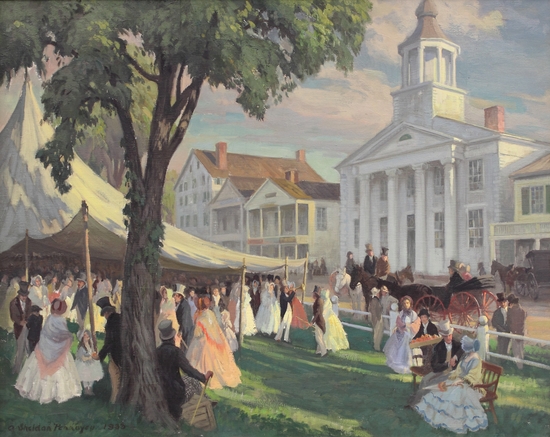 Large oil painting of Litchfield's town center. From right to left 1795 Court House, 2 stores, and Mansion House on corner. Village green in foreground with tent under a tree. People and carriages fill scene. Signed in lower left corner. Framed in wood gilt frame.
