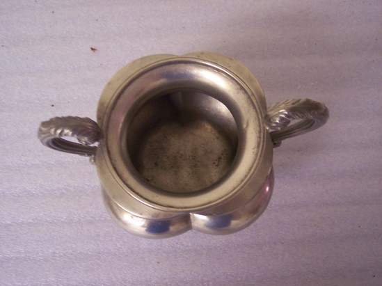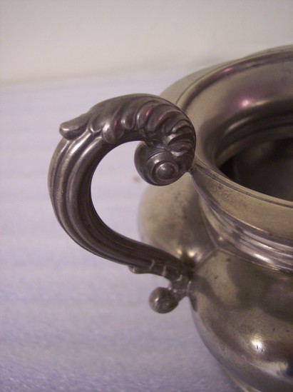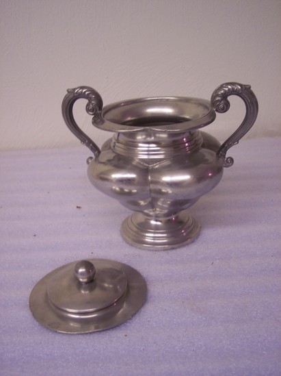Domed stpped base, pideon breasted 4 lobed body, high flaring neck, round steeped lid, S & C cast pewter S handles in floiage. Mark on underside of bowl "James Dixon & Son"