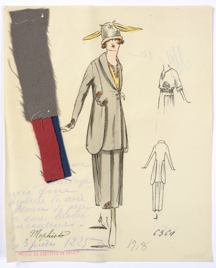 Lithograph and watercolor on paper fashion design. Wool suit with silk embroidery. Loose silk gauze blouse embroidered in colors. Fabric samples accompany rendering.