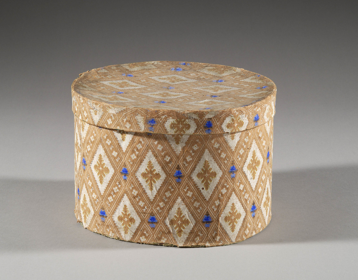Oval board box covered in roller printed wallpaper. The design features a pattern of white diamonds with orange geometric motifs on an orange background. The diamonds are formed by angled bands of orange featuring a pattern of rectangles with white outlines and geometric motifs and smaller diamonds containing blue flowers. White paper label on lid interior reads "William Campbell/Manufacturer of/Band Boxes/for/Bonnets, hats, Caps, Muffs, &c./No. 202 Main St. (up stairs) Worcester/All orders promptly attended to" in black.
