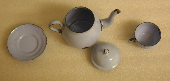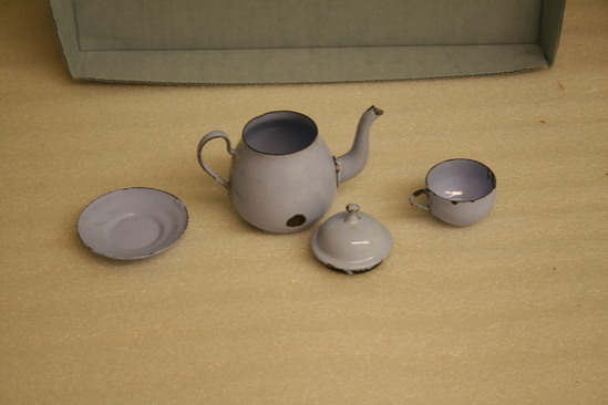 Three pieces of a doll's tea set. Teapot with lid, tea cup and saucer. Caste iron with baked on blue enamel finish. Tea pot with lid - enamel worn through and chipped in some places; spout is held on by small clips which are loose - evidently the spout was originally water proofed by the enamel finish Tea cup and saucer - enamel worn and/or chipped on these also.