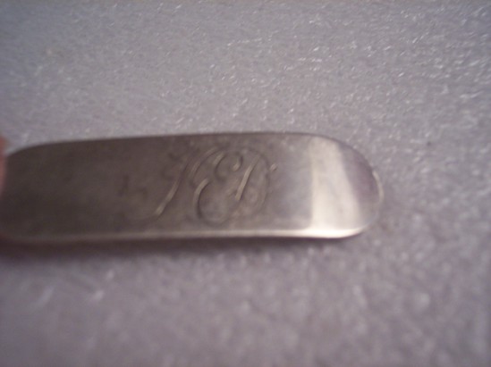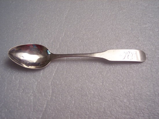 Silver teaspoon, egg shaped bowl attached to handle with trapeziodal drop. Narrow handle stem flares out slightly at shoulders to an elongated flat end with rounded tip. Reverse of spoon shows pitting in the bowl and some slight tarnish where the bowl meets the handle drop. Maker's mark on flattened handle end. Rounded end thickened slightly at tip with short line to divide tip into 2 lobes on underside. Maker's mark is "MB" in rectangle with rounded sides. Front of handle is engraved with "JED"