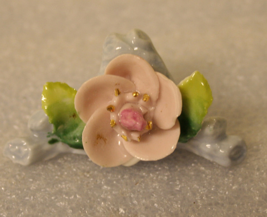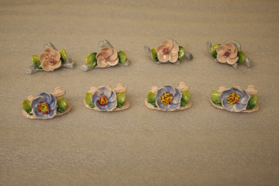 A-D - 4 ceramic place card holders. Large blue flower with green leaf on either side. Pink base and fencing behind flower. E-H - 4 ceramic place card holders. Large pink flowers with small gold accents in center. Green leaf on either side. Light blue base, raised in center behind flower. "Made in Germany" stamped on bottom of all eight holders.