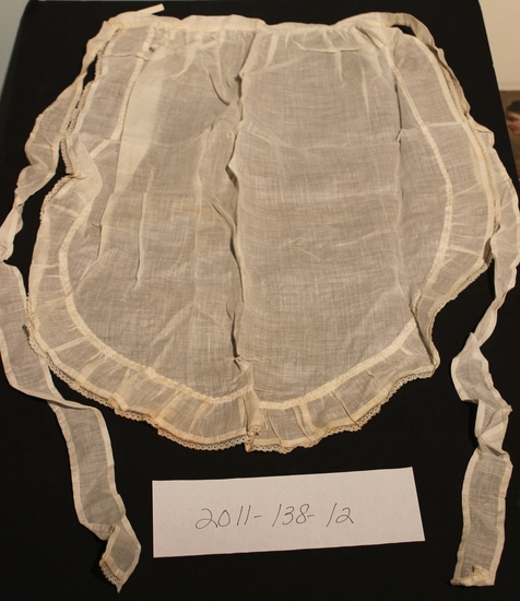 Sheer, ivory, linen apron; small and decorative, thus not for utilitarian use; narrow waistband with long apron strings; ruffle along apron front with narrow cotton lace edging and fern stitch embroidery where the apron front and ruffle meet; hand-sewn