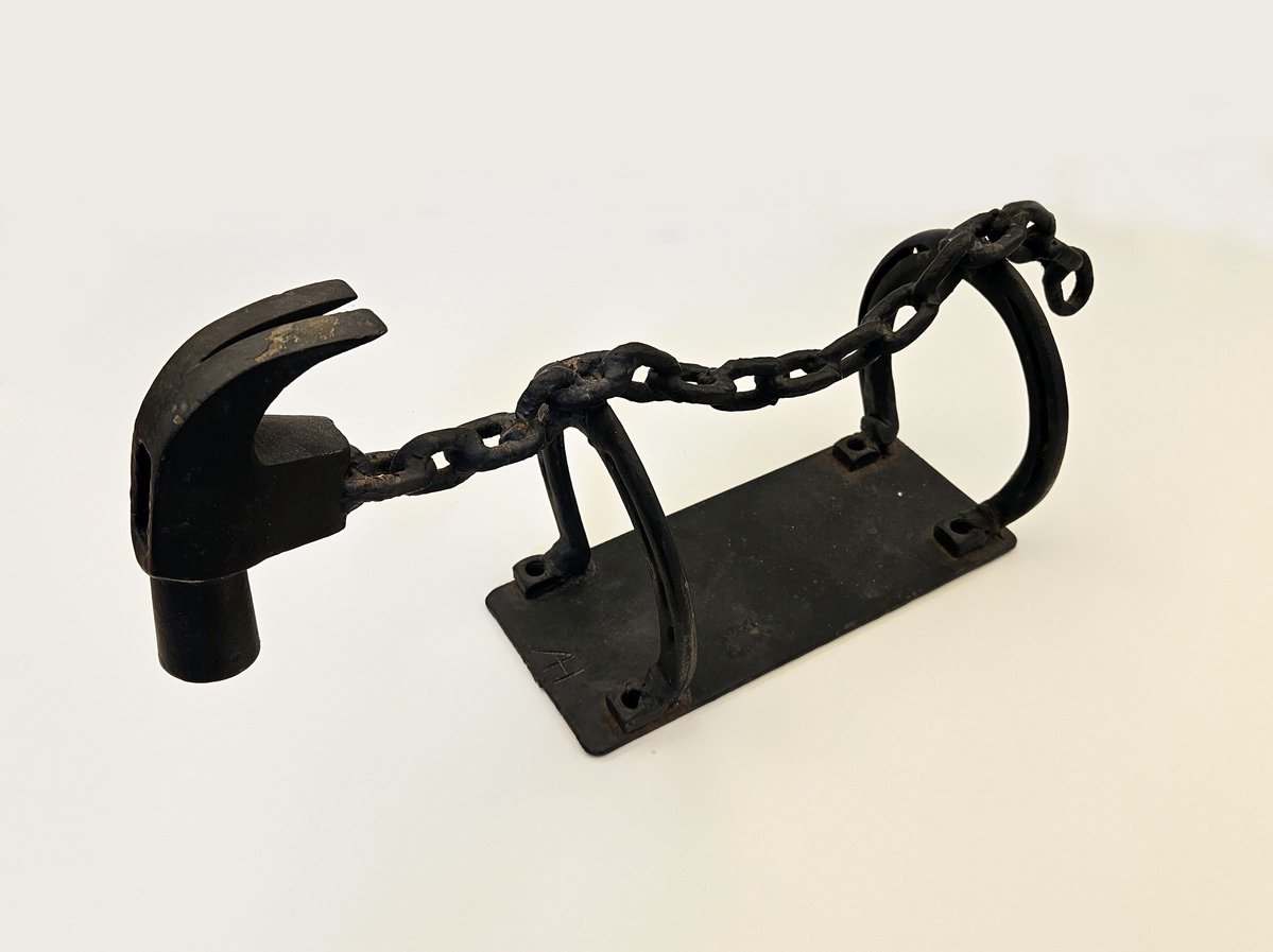 Metal sculpture of a dog or horse, created by welding found objects. Rectangular metal base with artist's initials, "AH." Legs formed by two horseshoes welded to base. Spine, tail, and neck formed by a thick metal chain with the links welded together. Head formed from a hammer's head. Sculpture painted black.