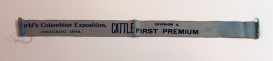 Long, narrow, blue ribbon printed with the words, "World's Columbian Exposition, CATTLE/ FIRST PREMIUM, DIVISION A/ CHICAGO, 1893."