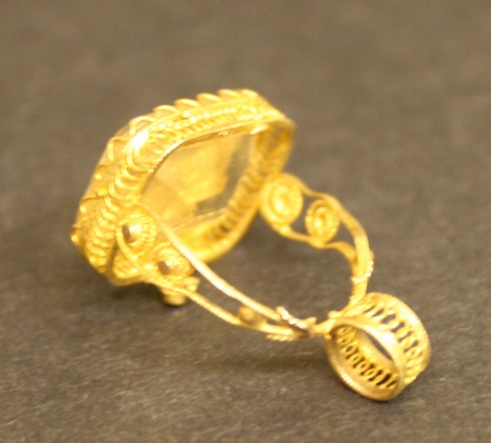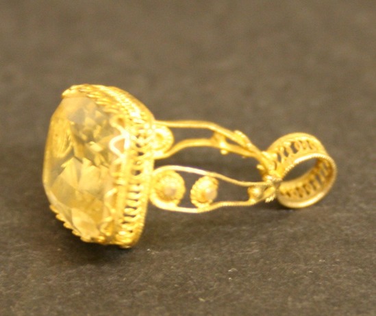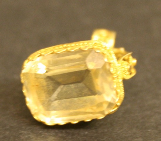 Rectangular shaped faceted white topez stone set in gold filagree setting with two arms extending down, behind stone. Wire arms with irregular shaped circles at random intervals in arms. Thick, filagree ring at bottom of fob. Two arms meet at this ring.