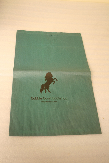Green paper bag from Cobble Court Bookshop. Name of store in black lettering. Silhouette of a black horse on it's hind legs above name of store
