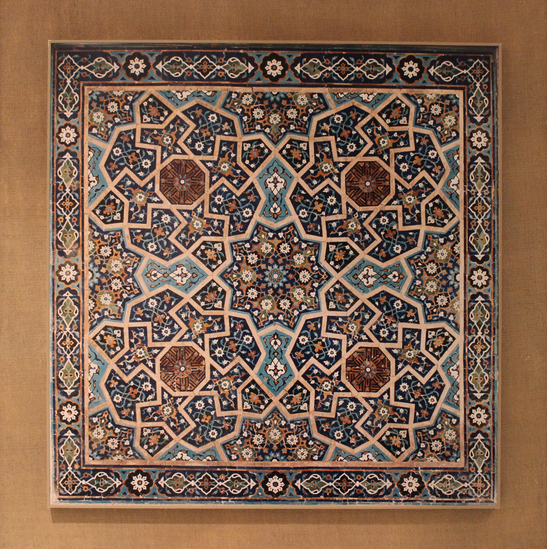 Large framed photograph - simple wood frame painted gold. Mat board of woven brown linen. Photograph of brown plastic border. Tile mostly blues and browns in color with accents of orange and green. Border of repeating scroll and floral design. Center has repeating pattern of interconnected floral like images. Larger images very geometric in apperance.