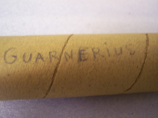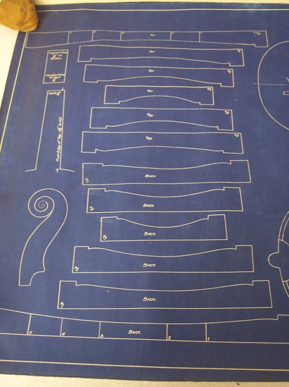 Scaled drawings of a violin. Signed "Elias Howe Co. - Boston" Printed on plan "Pattern/Joseph Guarnerius/Actual Size Outlines of/Paganini's Guernerius" Used in Fred Dautrich's shop. Evidence of tracing in certain areas, especially on the bridge