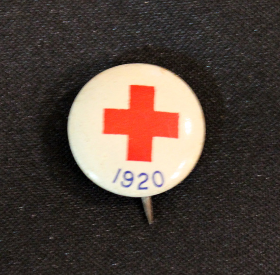 Small, round metal pin. White with red cross in center. "1920" in blue below cross.