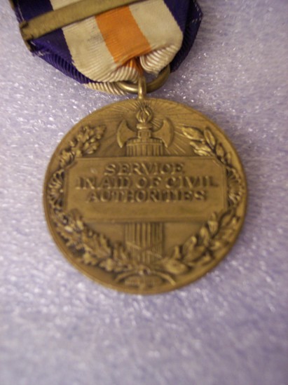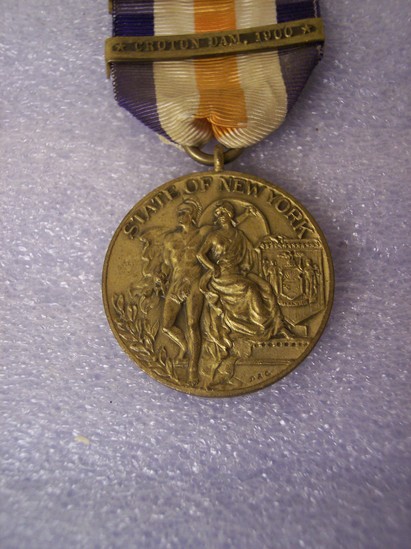 Red, white and blue striped ribbon with two brass bars "BROOKLYN, 1895" and "CRONTON DAM, 1900" Round medal pendant below: "STATUE OF NEW YORK" with two classical figures supporting state shield. Reverse has image of laurel and oak wreath with lictes in background and oblong shield with "SERVICE/IN AID OF CIVIL/AUTHORITIES"