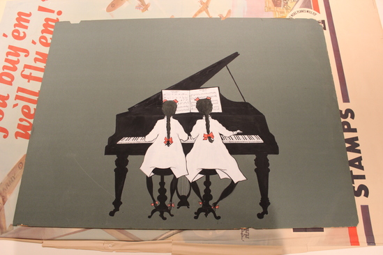 World War I ear poster. Blue-green cardboard poster. Image of two girls in white dresses sitting at a black grand piano with backs to viewer.