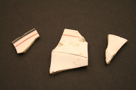 3 pieces of ceramics; possibly from plate(s); red and black stripes of different thicknesses
