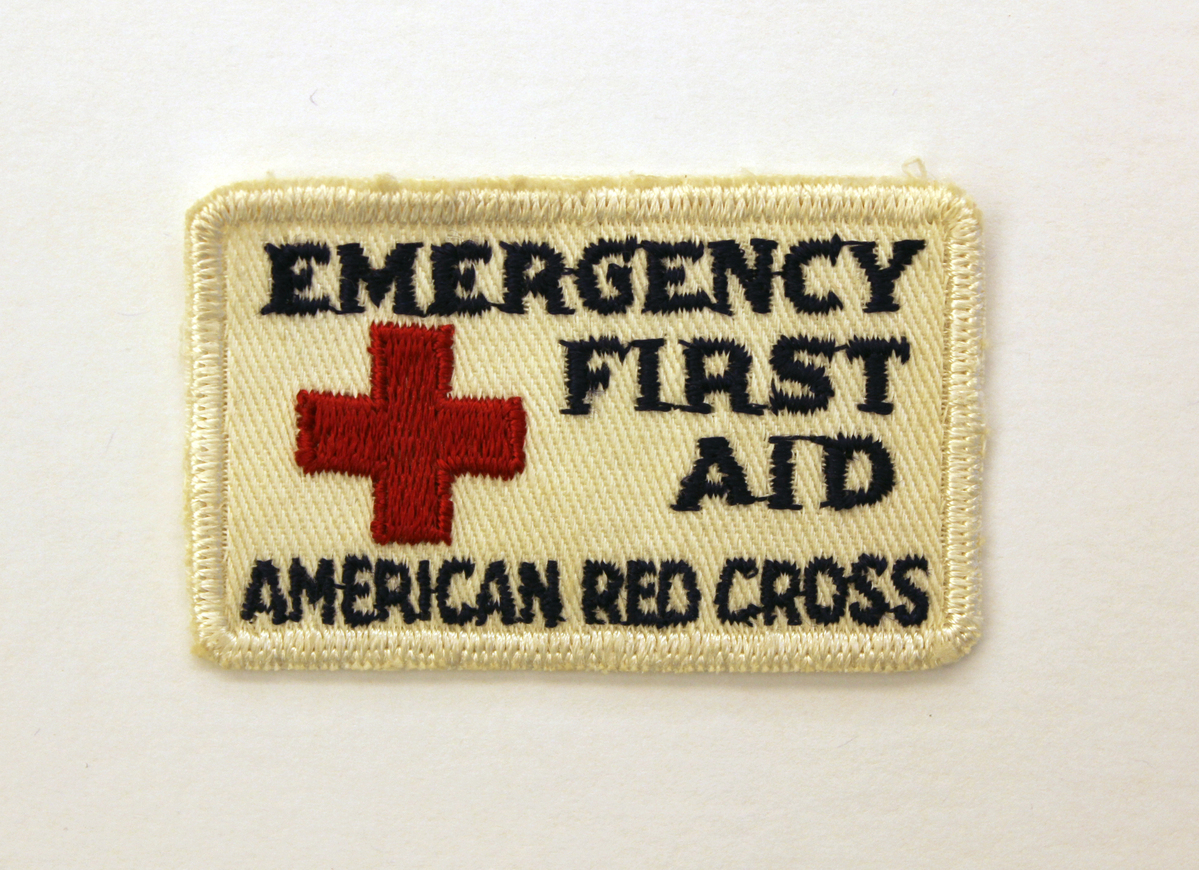 White cotton twill patch, American Red Cross. Rectangular patch with white embroidered edge and white ground. Embroidered lettering in blue, "EMERGENCY/FIRST AID/AMERICAN RED CROSS." At left is embroidered red cross. Cotton backstitching on reverse; merrowed edge.