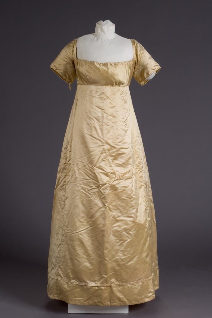 Gosling colored satin dress, empire waist, short sleeves, square neckline