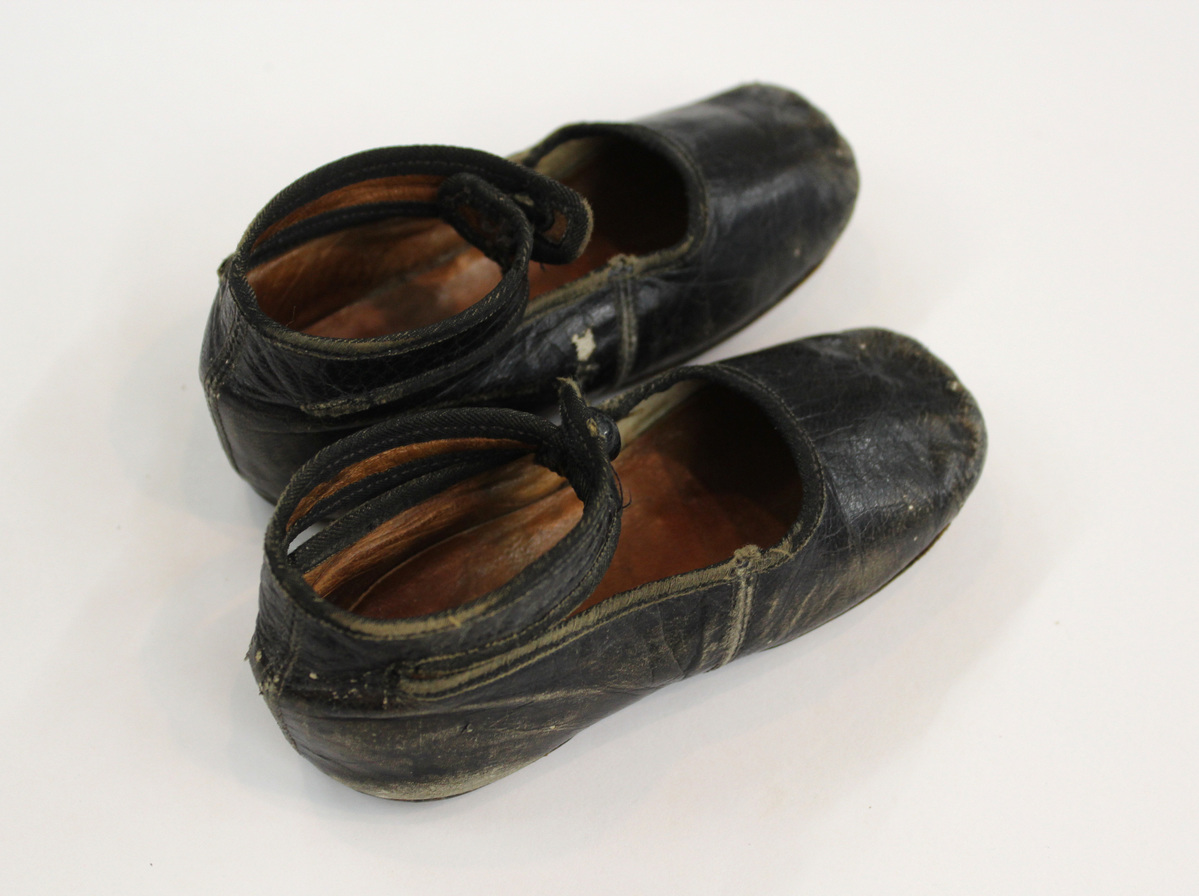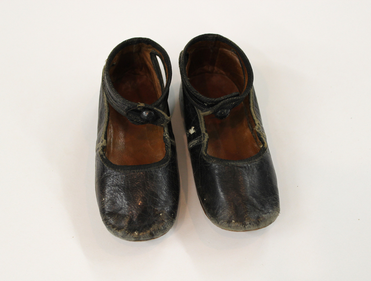 Pair of black leather child's shoes; ankle strap with wood button closure; square toes; tan leather and twill cotton lining; brown leather soles
