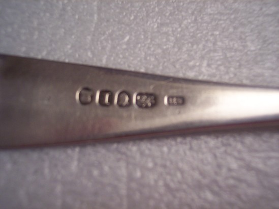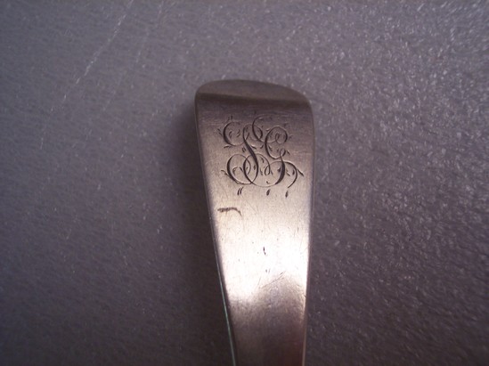 Large silver table spoon, monogrammed "SG in fancy script on handle. Ensko shape 1775. Serveral hallmarks on back "SH" in plain rectangle, lion passand, Lepard's head crowned, "T" in shield" and Kings head
