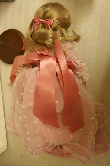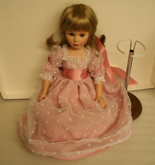 A - Doll - long curly stylized blond hair with bangs, pulled back with pink satin ribbon in back. Blue eyes. Plastic head and body. Reticulated at shoulders and thighs, specially reticulated at knee with fabric joint to allow doll to sit. The doll wears a pink polyester underdress, sheer white overdress of polyester with embroidered star pattern overall. Wide pink satin ribbon at waist, square neckline with ruffle of white lace. 3/4 length sleeves, pink ribbon of elbow level, white lace ruffle at end. White cotton petticoat with bodice attached, white cotton pantaloons, white polyester leggings and pink shoes. Doll comes with a wooden and metal stand allowing doll to stand upright. B - artificial flower bouquet.