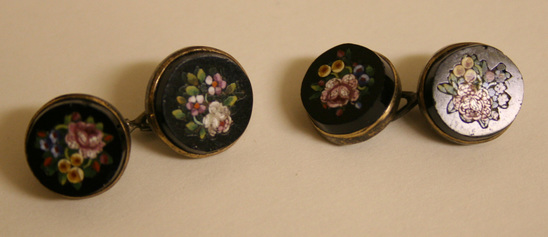 Pair of cuff links. Each consisting of a pair of round black stones set with multi-colored inlay of floral bouquet. Stones have sloping sides in silver gilt collars with closed backs and loops joined by "8" figured wire to form cuff links.