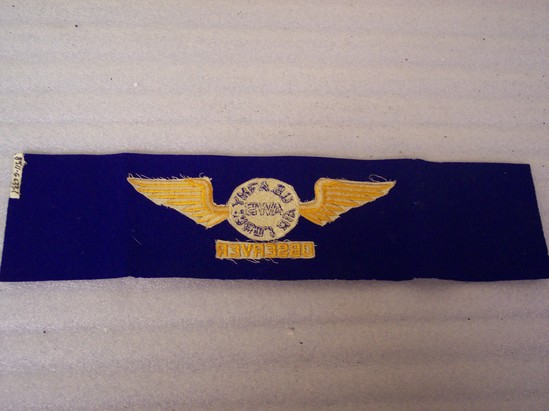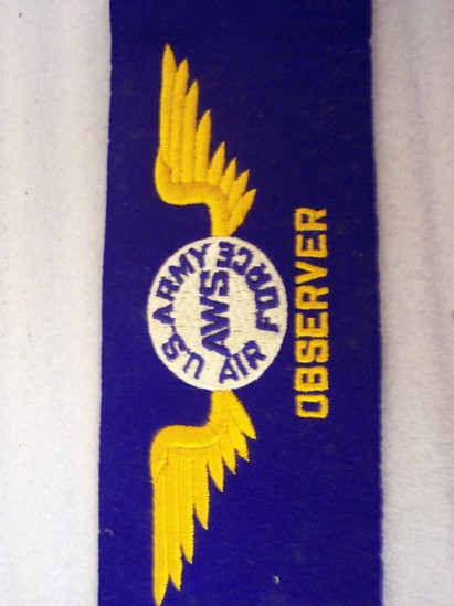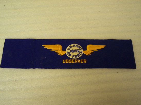 Blue felt band. In center is white circle with "U.S. ARMY/AIR FORCE/AWS" in blue lettering. Large gold wings extending from sides of circle. Underneath in gold lettering "OBSERVER" All done in silk thread.