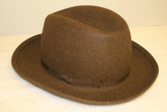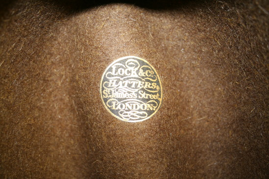 Man's brown wool fedora style hat. Double seam line around brim. Brown grosgrain ribbon around circumference of hat with flat bow on one side. Leather band on interior of hat. Maker's label stamped in gold "Lock & Co./Hatters/St. James Street/London" on leather band and inside top of hat.