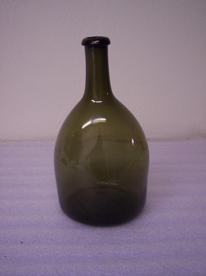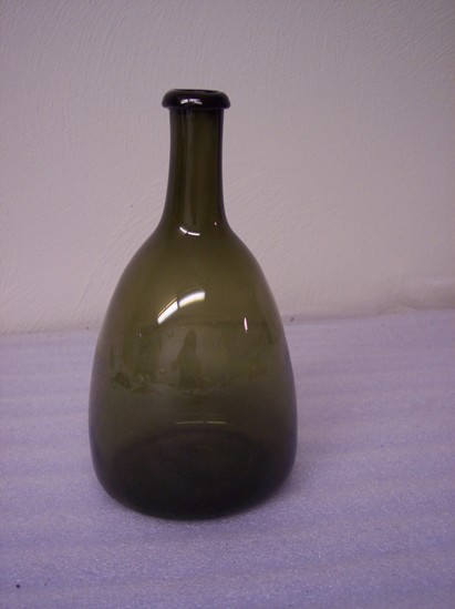 Glass bottle, dark green glass, pontil mark on bottom, free blow, irregularly shaped.