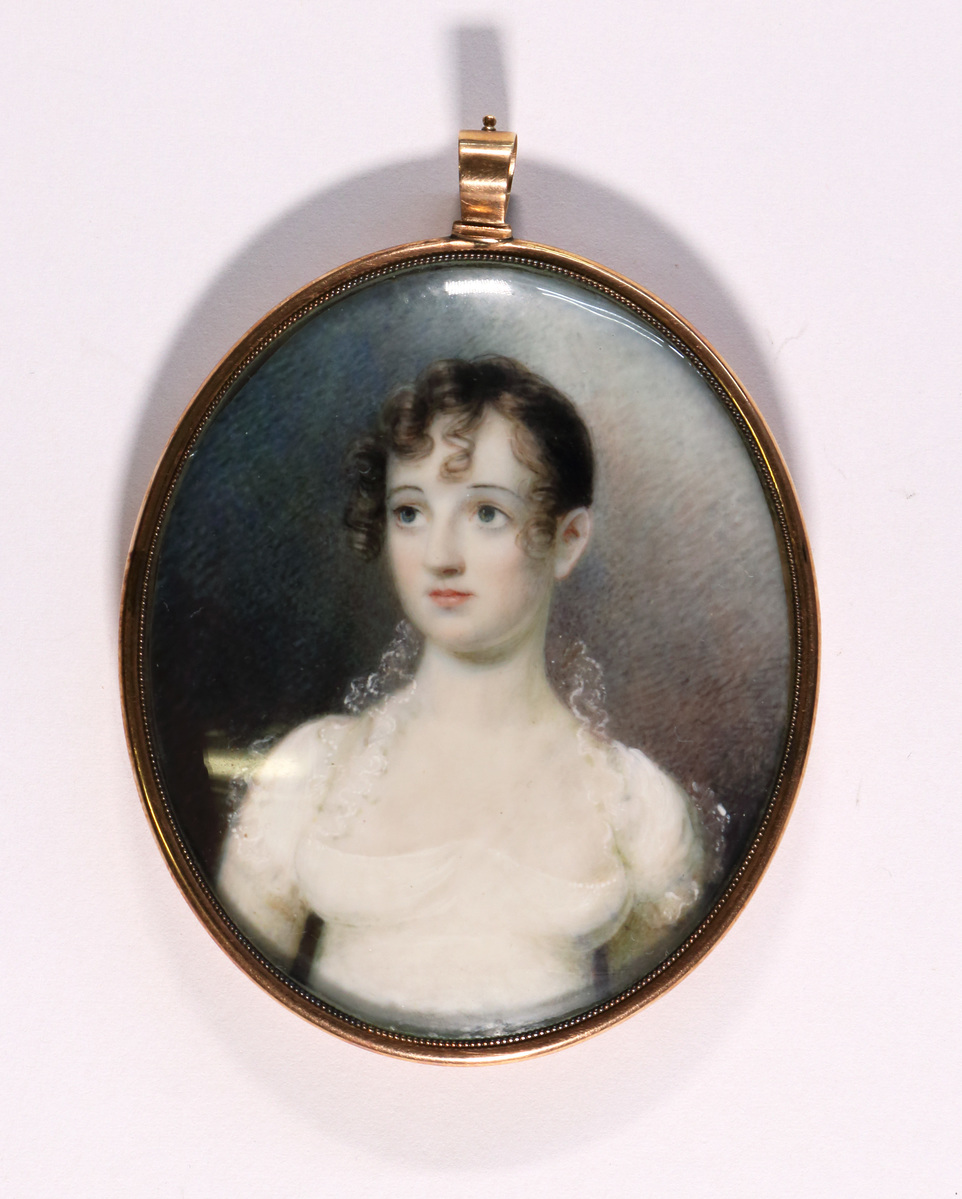 Bust portrait of young woman wearing white low-cut empire dress. Brown hair, brown eyes. Grey-blue background. Gold frame with tiny beading inside lining. Finial top, strap loop at top. Back plain with glass convex oval cover for brown lock of hair on woven background. Tiny beading around glass.