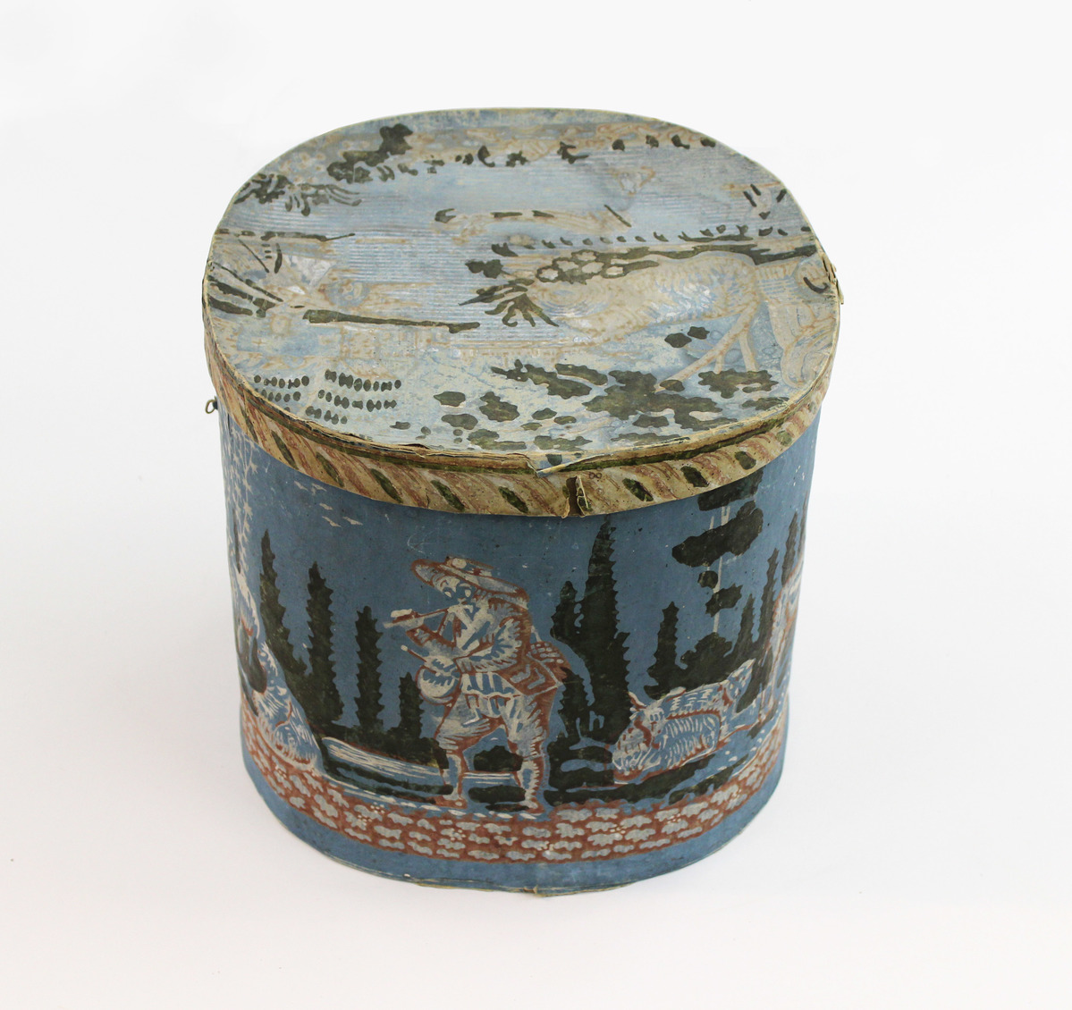 Bandbox lined with white paper and covered with blue paper with shepherds, sheep, and cows in white, green, and red. The top has a paper of same colors but is printed with a harbor scene with buildings, boats, and a large antlered animal lying among bales. Top has green, pink, and white border printed on yellow ground.
