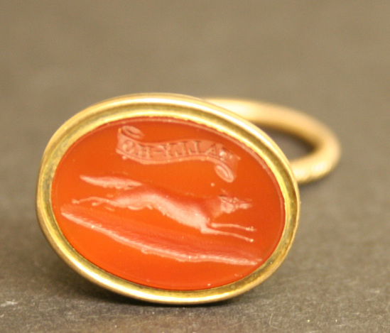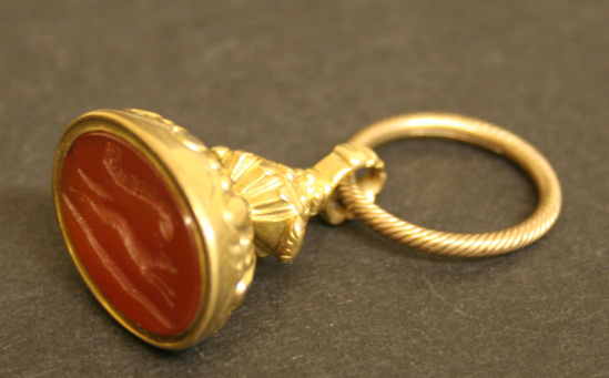 Cornelian stone set in a gold watch fob. Fob has gadrooned gold backing with complex squared shank and loop having a twisted gold split ring. The cornelian is carved with an incised design of a running fox and the words "Tally Ho"