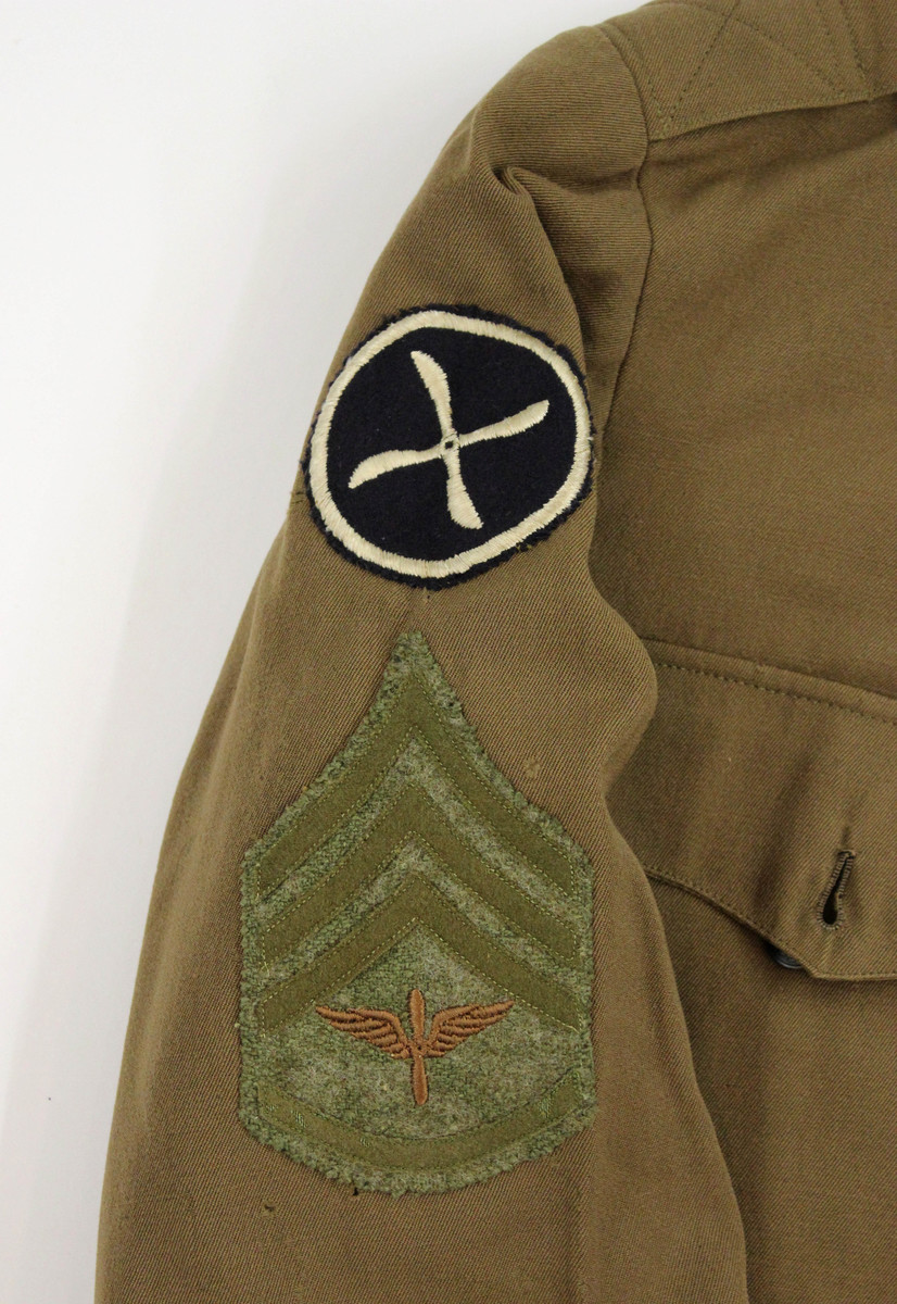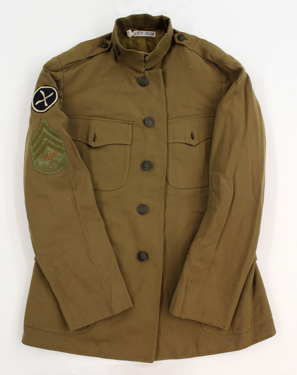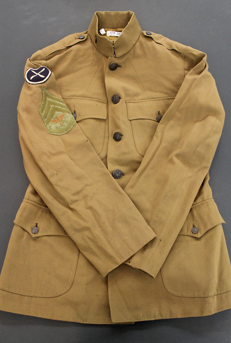 Olive brown wool jacket; stand up collar with one "US" button; four patch pockets; metal buttons; two patches on right arm - circular one with white propeller on black field and green chevron patch - three stripes, propeller with wings; epaulets; lined with light weight wool; label inside jacket "The Tate-Brown Company Charlotte, NC."