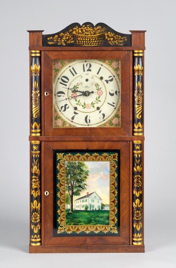 Classical design of wood finished pine and maple. Frontice piece a decor of pillars painted black with gold leaf maple leaf design with flower motif. Cornice black with fruit basket and leaf design in gold. Clock face has white background with pink forget-me-nots, arabic numerals, gold background surrounding trim. Brass works with iron weights included.