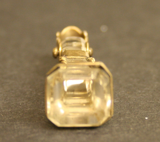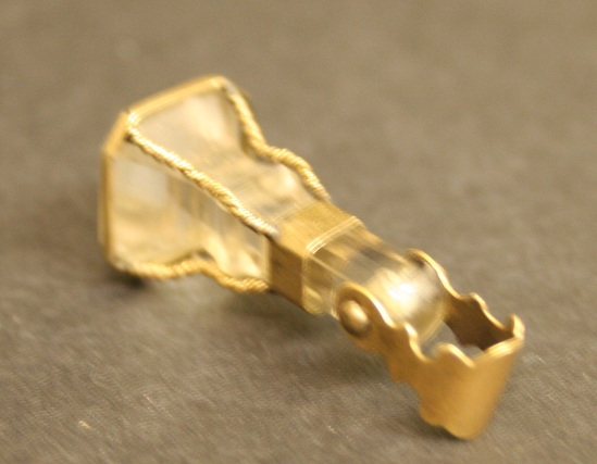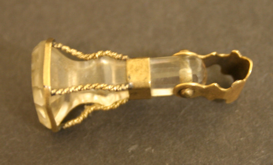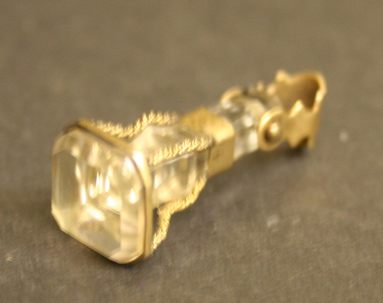 Square cut and faceted seal end with shank banded at collar and on shank. Golf bands attached in corners by wire rope, gold sheet chain loop with scalloped edges pinned through end of crystal shank.