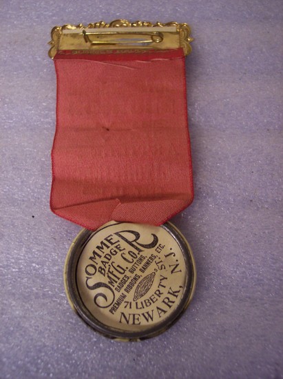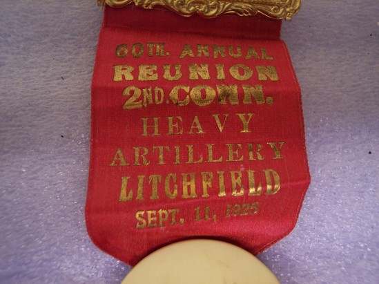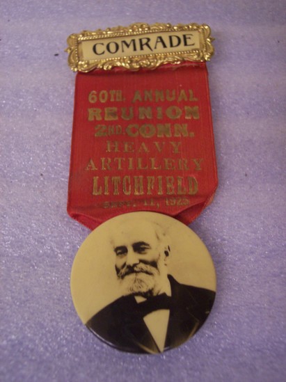 G.A.R. badge with gilt stamped tin rococo framed oblong medal with "COMRADE" in black on white plastic. Red ribbon with gilt lettering: "60TH Annual / Reunion / 2ND Conn ./ Heavy / Artillery / Litchfield / Sept.11, 1925" Attached at bottom is a round metal button with portrait of a bearded man.
