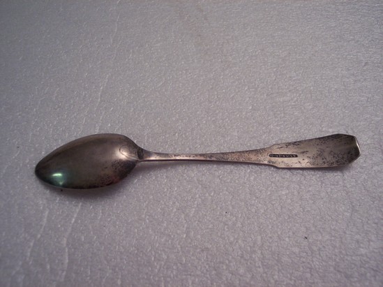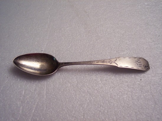 Silver teaspoon, handle has cut squared off corners and a border of engraved decoration ending in two tier pendant on shaft which is attached to bowl in back with a joint similar in profile to handle, details distinctly federal in style. Initials "WVW" etched into handle. Hallmark on back of spoon "BWENMAN"