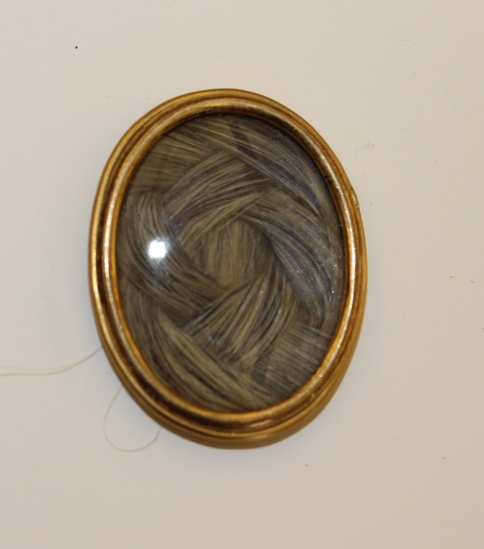 Oval gold locket pin with lovers knot of hair woven under glass crown, cardboard back