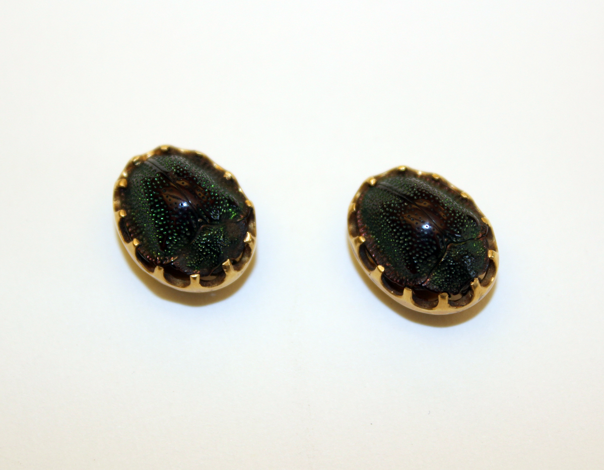 Pair of buttons or shirt studs. Oval shaped gold setting with green and red colored scarab set in center. Scarabs resemble beetle shells in appearance. Flange riveted to cross bar on back of stud.