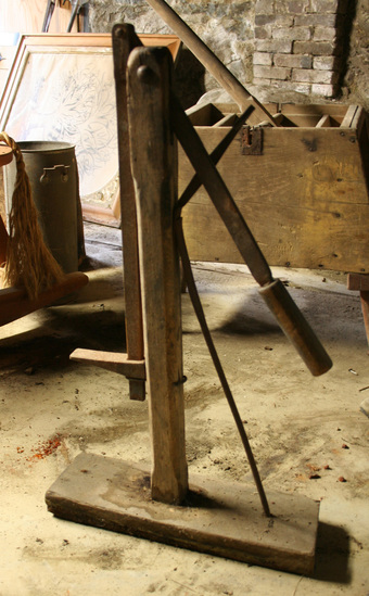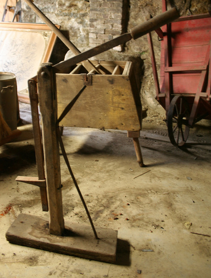 Wooden wagon jack. Rectangular base with wooden pole mounted in center. A notch is cut at top of pole and a metal rod with wooden handle hinged at that point. The handle can be raised and lowered. It is connected to an L shaped piece of wood that hangs beside the center wooden pole. A thin metal pole is set at an angle between base and center pole to stabilize jack.
