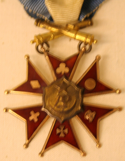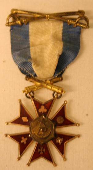 Pin bar at top, brass, ornament on front of two crossed swords in sheaths. Blue and white ribbon extending from pin bar. Gathered at bottom by metal ring with ornament of two crossed cannons. Hanging from cannon ornament is a medal. Medal has round brass center with 6 arms extending from center. Each arm is enameled red with different symbol in gold in center - clover, diamond, circle, cross, etc. Center has "AP" with star over head and quarter moon underneath