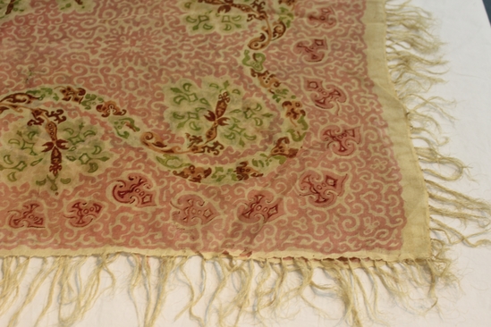 Scarf, cream ground with pink swirled design throughout; repeating pattern around border in greens and browns; circular design in greens and browns in center; trim around edge