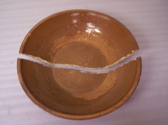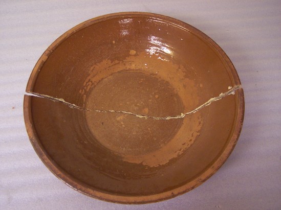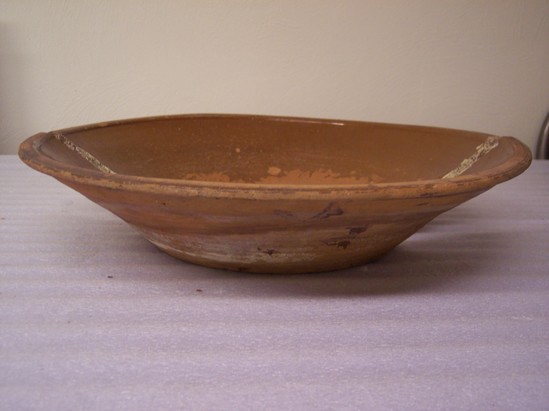 LARGE SHALLOW BOWL WITH GLAZED INTERIOR, UNGLAZED EXTERIOR. ROLLED RIM, PLAIN BASE.