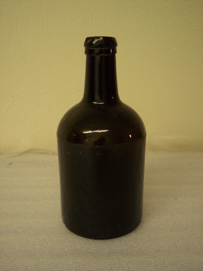Wine bottle, dark green glass, appears almost black. Round body with short neck. Pontil mark on bottom