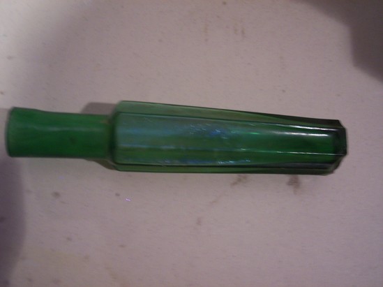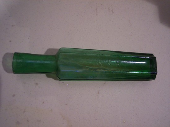 Bright green glass bottle. Thin, rectangular shape with pronounced neck and wide opening. Glass pressed in mold, seam lines along sides. Pressed onto one side "W & R"