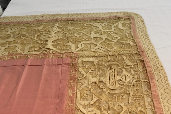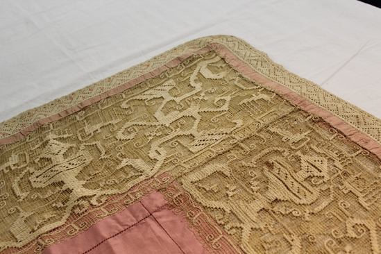Center of shawl is area of rose pink silk; large embroidered border - white linen on loose (or open) linen ground (filet crochet); band of pink silk ribbon at bottom; border of repeating crocheted pattern in white cotton