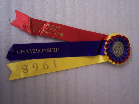 Each ribbon consists of cardboard base to which is attached a plastic silhouette of a horse's head. 3 layers of ruffled satin surround plastic; 2 satin ribbons hand from bottom. A & B are white, C is red, and D is red, blue, gold, with gold rosette ("Championship")