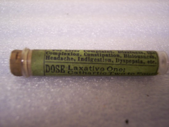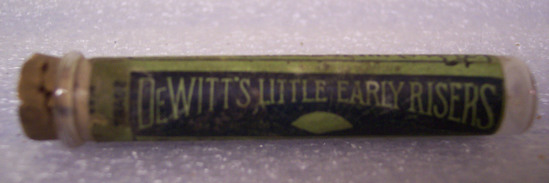 Glass tube with cork stopper, green paper label with blue print "DeWitt's Little Early Risers"/For Liver Complaint, Dizziness, the Complexion, Constipation, Bilousness, Headache, Indigestion, Dyspepsia, etc."/Dose: Laxative One/Cathartic Two to Four" "Prepared only by/E.C.DeWitt & Co./Chicago, Ill."