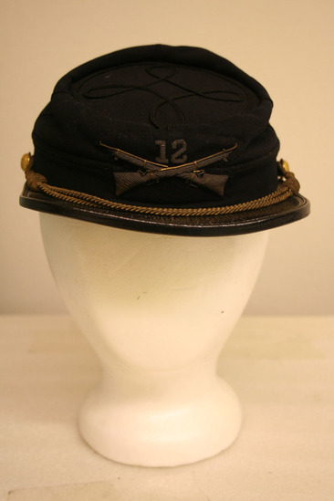 Dark blue wool cap; flat top tilted forward with blue yarn design on top; flat, black plastic visor in front with gold cord attached with two gold buttons running along base of visor; in front, center of hat, a blue and gold cord design with two rifles crossing and the number "12" in between; brown leather band and black silk lining inside; label "Ridabock & Co. formerly Baker & McKenney Military Goods 141 Grand St New York"