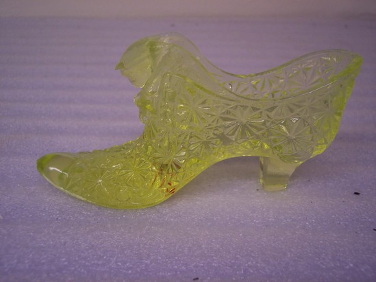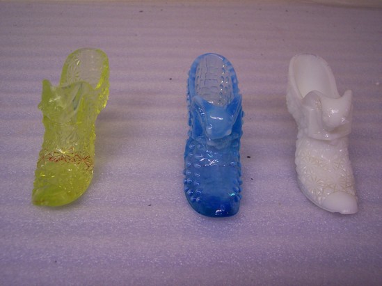 a: yellow colored molded glass slipper, daisy pattern b: blue colored molded glass slipper, hobnail pattern c: Clam broth color molded glass slipper; daisy pattern All have high heel, alligator toe, puss in opening